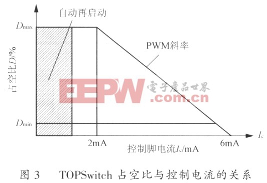 对于图2电路,主要就是要确定R4、R5、R6及R7的值。电路利用输出电压与T1431构成的误差比较器,通过光耦PC817线性关系的电流变化控制TOPSwitch的Ic,从而改变PWM宽度,达到稳定输出电压的目的。从TOPSwicth的流入控制脚C的电流Ir与占空比D成反比关系,如图3所示。