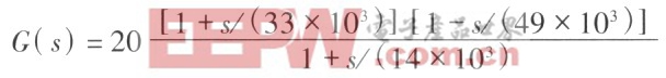TOPSwitch的开关频率为100 kHz,为了避免其引起过多的相移,一般取带宽为其频率的l/4一1/5,我们取1/5为20kHz。则此时的相位φ=arctan(20/33)一arctan(20/14)-arctan(20/49)=-46°