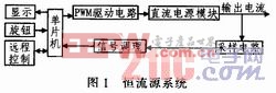 本文所提出的程控恒流源是以单片机为核心,通过与电压电流转换电路相结合的方法,实现电流可预置、可连续调节的功能,该系统主要包括两大部分:数控模块和直流电源模块。本设计的系统结构框图如图1所示。