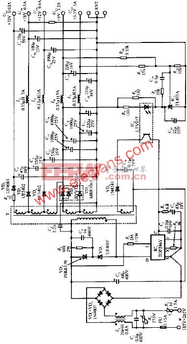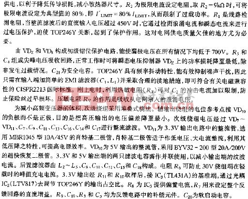 由TOP246Y构成的45W多路输出式开关电源的电路如图所示。它可作为机顶盒、电报译友器、大容量硬盘驱动器或笔记本电脑的开关电源。该电源在输入电压为交流185V~265V时,额定输出功率为45W,峰值输出率可达60W。电源效率N大于或等于75%,空载时的功耗仅为0.6W。五路输出分别为:UO1(5V、3.2A)、UO2(3.3V、0.03A)、UO4(18V、0.5A)、UO6(12V、0.6A);它们的负载调整率依次为正负5%、正负5%、正负8%、正负7%、正负7%。现将5V和3.3V作为主输出,并按一定的比例引入了反馈量,使这两路的稳压性能最佳。其余各路为辅输出。