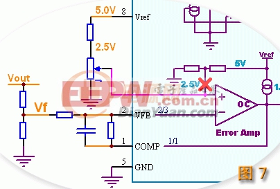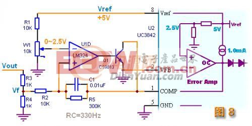 3842的基准参考电压放到芯片里了,只有忍痛割爱,放弃这个片内E.A,再搭一个和这个相同的片外E.A,电路如图8所示。