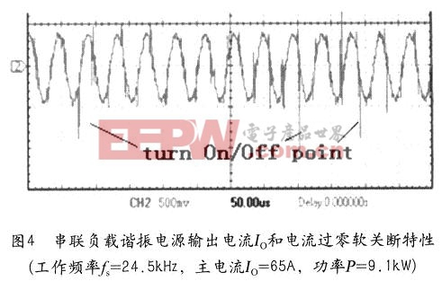 由于实际谐振电源控制电路在电流过零关断驱动IGBT时存在误差,产生瞬时脉冲震荡不可避免,驱动误差越小则脉冲震荡越小,脉冲震荡小,电源电子开关IGBT工作安全性就高。图4和图2中的波形毛刺就是IBGT驱动关断误差形成的脉冲震荡电流,它表明在大功率工作状态下,本文研制的电源系统在电流过零关断控制串联负载谐振方面,达到了很高的技术水平,完全保证电源大功率状态下长时间连续工作的要求,结果令人满意。