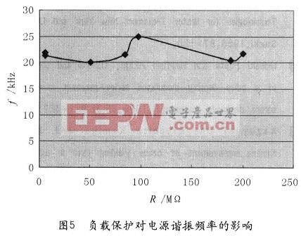 在本文研制电源系统的工程运用试验中,发现系统的负载不稳定,湿度对负载电气特性产生不良影响。在不同天气情况下进行了系统的负载测试,显示系统负载的电阻特性发生很大变化,从1.56MΩ~200.0MΩ。电源系统的在负载变化情况下,运行谐振频率相应变化,运行结果见图5。