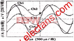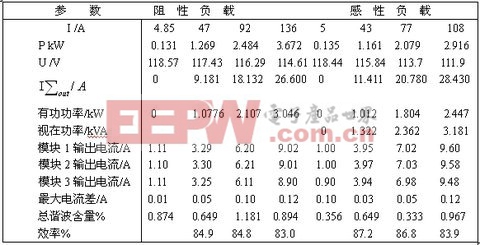 看出当两台逆变模块的输出滤波电容不相等时会在两逆变模块间产生环流,这一环流正比于两滤波电容的差△C。 (2)当C=C1=C2,令 ,则式(4)化为 (5) 其中: 。从式(5)中可以看出当两台逆变模块的电流放大倍数不相等时会在两逆变模块间产生环流,这一环流正比于两逆变模块电流放大倍数差△K。 综合(1)与(2)分析可知:在共用一个电压调节器的多电流模块并联系统中,欲使各模块均分负载电流,必须减小各逆变模块间在电流反馈环节、输出滤波环节上参数的差异。 2.4 并联系统动、静态分析 假设3个模块的输出滤波电感和输出滤波电容相等,各电流环的放大倍数,输出线路阻抗均相等,即:L1=L2=L3=L,C1=C2=C3=C,r1=r2=r3=r, ,对于该航空静止变流器并联系统,并联连接线较短,输出线路阻抗r非常小,可以忽略,因此U0≈U1。 假设单逆变模块的负载为R,电压环的放大倍数为k,积分时间常数为rV,可得单逆变模块的正向通道传递函数为 (6) 反馈通道传递函数为H(s)=Kv (7) 单逆变模块的输入输出传递函数为 (8) n个单逆变模块并联后,并联系统的正向通道传递函数为 (9) 由于是共用电压环,因此,反馈通道传递函数不变 H′(s)=Kv=H(s) (10) 并联系统的输入输出传递函数为 (11) 比较式(6,9)和式(8,11),n个模块并联系统的负载为nR时的正向传递函数和输入及输出传递函数与单模块负载为R时完全一致,即n模块并联系统动、静态特性与相应n分之一功率输出的单模块的动、静态特性完全一致。因此,并联系统的动、静态特性较单模块有所提高,输出功率增加了n倍:P0′=nP0。 单逆变模块逆变器的等效输出阻抗为 (12) 并联系统的等效输出阻抗为 (13) 由此可见,与单模块相比,并联系统的放大倍数提高,输出阻抗减小,外特性变硬。并联系统空载时输出电压与单模块相同,在相同负载条件下,输出电压下降量减少。系统的输出功率与并联模块数量成正比。 3 3kVA 27VDC/115V 400Hz航空静止变流器调试与实验结果 经过上述分析,用Saber仿真软件进行了仿真,结果与分析结果一致。并联运行前,将3台航空静止变流器的电流环的反馈系数和输出滤波参数调整至基本一致。逆变器控制参数为:kvf=0.034,kv=12.14, ,ki=1.471。以下为实验结果: 输入电压:20VDC~30VDC,输出功率:3000VA,输出电压:115V±3%,输出频率:400Hz±0.1%,输出失真度:≯2%,整机效率:≮82%。 表1给出了该系统在输入直流母线电压为额定电压27V时,负载分别为阻性和感性情况下的实验数据。 图5给出系统在阻性额定负载(3KW),航空静止变流器输出电压U0和3个逆变模块的输出电流i01,i02,i03的波形。(不均衡度优于1.31%)。图6给出系统在感性额定负载(3KWA)(cosφ=0.766),航空静止变流器输出电压U0和3个逆变模块的输出电流i01,i02,i03的波形。(不均衡度优于0.09%)。 图5 阻性额定负载下,逆变器输出电压及各模块输出电流波形 说明::图5中Ch1为输出电压U0(250/格),Ch2为模块1的输出电流i01(10A/格);Ch3为模块2的输出电流i02(10A/格),Ch4为模块3的输出电流i03(10A/格);时基为1ms/格。 图6 感性额定负载下,逆变器输出电压及各模块输出电流波形 说明:图6中Ch1为输出电压U0(50V/格)时基为500μs/格,Ch2为模块1的输出电流i01(10A/格),Ch3为模块2的输出电流i02(10A/格),Ch4为模块3的输出电流i03(10A/格)。 从上述实验数据和波形可以看出::利用该种方法实现航空静止变流器并联,对于阻性负载及感性负载具有较好的均流性能,不均衡度优于2%。 在本系统中,由于所有并联模块都跟踪统一的电流给定,保证了各模块的电流相位和幅值均能一致,。因此,并联模块间的均流精度较好,并且,在突加突卸负载时,整个系统都能保持稳定,并联模块间的均流精度不受影响。另一方面,由于所有并联模块均为电流型模块,插入及拔出系统时对系统的输出电压影响很小,因此,该系统的热拔插设计较电压型模块的并联热拔插设计要方便得多。同时,可以采用文献5中的分散逻辑方案实现控制冗余。 4 结 论 本文对基于主从控制的电流控制型逆变器并联系统进行了研究,经过分析和实验可以得出以下结论: (1)对基于电压、电流双闭环控制的逆变器,可采用公用电压环的方案构成主从式并联系统; (2)公用电压环的方案构成主从式并联系统动静态特性较单模块有所提高; (3)电流瞬时控制提高了系统的动态响应速度,输出电压的失真小; (4)并联系统的输出阻抗变小,输出功率与并联模块数量成正比; (5)模块间环流的大小与各模块的电流环放大倍数以及输出滤波电容的误差成正比。保证各模块的电流环放大