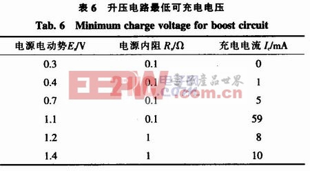由表6可知,逐渐降低电源电势Es时,充电电流也随着下降。当Es到达0.4 V时输出电压已经在O V附近变化,因此能向电池充电的最低Es为0.4 V。