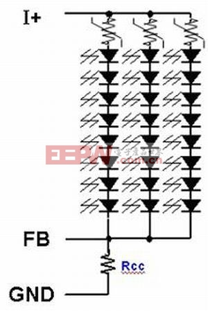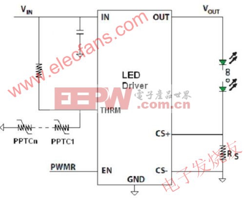 此外,PPTC可以作为温度传感器与LED驱动器配合使用,实现LED阵列照明的过热保护(图8),在大型阵列照明中,由于LED灯串众多且结构较为复杂,在实际应用中容易出现过热故障的位置,往往并不固定于某个特定的位置,因此单颗过热检测器件很难提供完善的过热保护。PPTC在正常工作下的低电阻以及正温度系数特性,可以方便地将数颗PPTC串联于热保护检测电路,实现多点过热监控。将多个PPTC串联、并安装于可能出现过热的部位。由于PPTC的低电阻,THRM引脚电平为0,电源电路正常工作。当灯具某处或多处发生过温故障时,THRM回路中的一颗或几颗PPTC受热,电阻急剧上升,THRM引脚电平变为高电平,从而启动LED驱动器设计的过热保护方案,实现过热关断或过热折减驱动。这种解决方案对LED面光源的过热保护而言经济有效。泰科电子可以为客户提供相关的设计及验证服务。