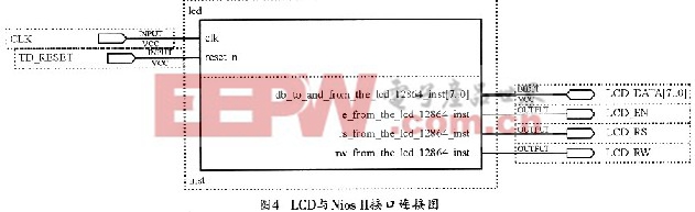 完成LCD_12864器件的加入后,LCD_12864器件就会出现在SOPC Builder的组件选择栏的“User Logic”项目下。图4所示是LCD模块的管脚分配图。