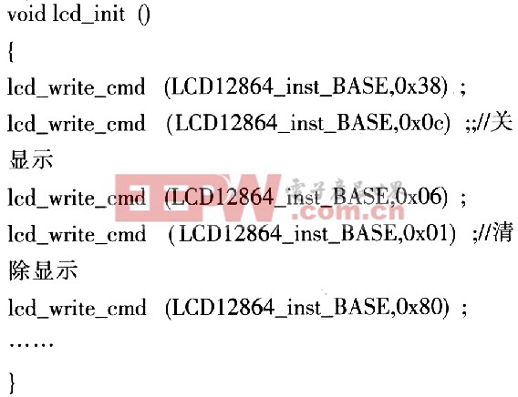LCD模块的初始化就是对LCD进行模式设置。由于SOPC Builder中的LCDl2864控制模块已经考虑了LCD的读写时序,所以使用NiosⅡIDE进行LCD驱动和控制时只需对LCD进行初始化。其部分初始化子程序如下: