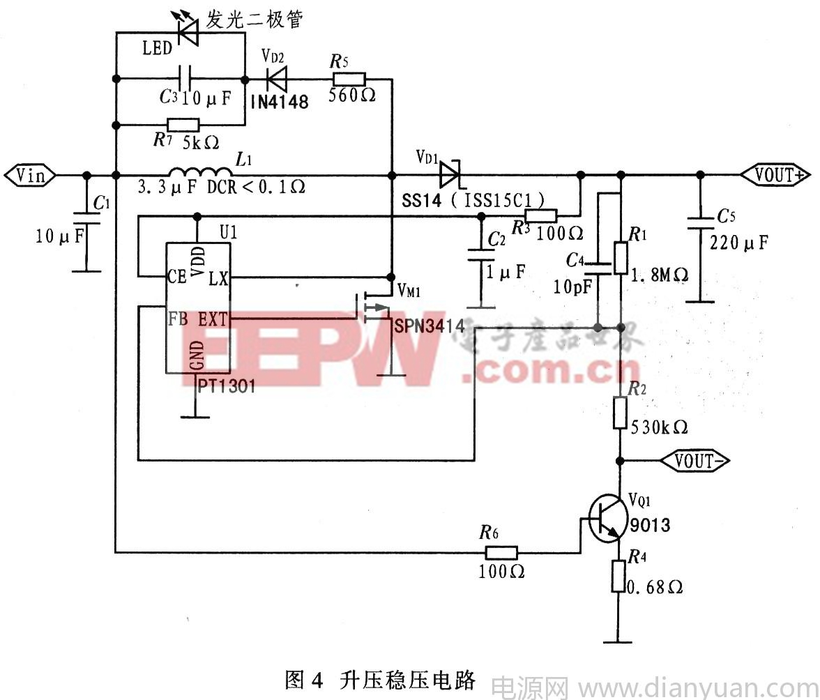 根据塞贝克效应,直流电产生模块两边的温差不稳定,输出电压也会不稳定。因为很难将环境温度(冷端的温度)控制在一个固定值,所以输出电压需经过稳压后才能送入手机。根据手机充电要求,选择升压DC/DC转换器件PT1301实现升压稳压电路,如图4所示。输出电压由两个外部电阻设定,即输出电压