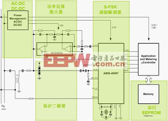 此外,AMIS-49587采用S-FSK调制技术,结合高分辨率的滤波算法,配以自动可信值/中继器(repeater)功能,提供基于长距离电力线的高可靠性数据通信。通信误差比其它可选及现有方案更低。这器件藉板载低抖动锁相环(PLL)与交流主电源(mains)信号同步。由于包含16位分辨率的模拟前端,使器件具有极优的噪声免疫性和极高的接收灵敏度。