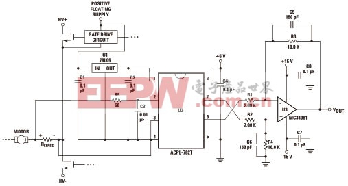 ACPL-782T是在电子马达驱动器和电池系统监控中使用的小型绝缘放大器,用于电压和电流检测。在典型应用中,马达电流流过一个外部电阻器,产生的模拟压降被ACPL-782T检测。在ACPL-782T光隔离屏障的另一端,生成了差分输出电压。差分输出电压同马大电流成比例,并且利用在推荐应用电路中使用的光放大器可以将其转换为单端信号。由于在现代的开关转换马达驱动器中,在几十亿分之一秒内出现几百伏的电压摆动很常见,ACPL-782T可以忽略非常高(至少10kV/µs)的通用模式瞬间回转速度。