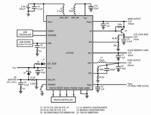 图4示出了一种用于便携式GPS导航装置的完整、紧凑而高效的电源。VMAIN(固定3.3V)负责向I/O电路供电。用于处理器内核的电源VCORE被设定为1.8V,并可通过改变反馈电阻器阻值比来调节。3.3V热插拔输出负责向闪存卡供电。LTC3456包含一个独立增益部件(AIN和AO引脚),可被用作一个低电池电量指示器或一个LDO控制器。图4中的电路示出了被用作一个LDO的增益部件,并由一个外部PNP来从主输出生成一个2.8V的辅助输出电压。该2.8V辅助电源被用于给一个LCD控制器IC供电。LTC3456的VMAX输出即使在停机期间仍然处于工作状态,并被用来向一个实时时钟供电