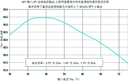 为了测试新的中间总线结构的性能,使用了从一开始就设计的模块进行实现,从而来优化IBA。图1的直流总线变换器结合了两个iP1202 POL得到了3 输出的示范单元,如上图2所示。图3显示了IBA 是如何达到84.5% 的总电气效率的,使得它成为一个具有吸引力的选择满足集成有低压逻辑、处理器和ASIC的现代系统的要求。