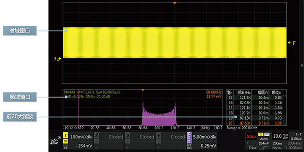 现在,多数2000系列示波器最大只支持8K样本点的FFT分析,在1G采样率的情况下,频率分辨率仅有125KHz,多数情况都无法准确判断信号频谱分布。而ZDS2024示波器内部采用了专业的处理芯片,将FFT分析点数升级至4M样本点,同样在1G采样率的情况下频率分辨率能精确到250Hz,可以准确分析出电路中的干扰噪声来源,大大提高了示波器FFT的实用价值。