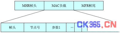终端节点的硬件平台主要包括核心控制器、I/O 接口、存储模块及射频收发模块等,其硬件构成决定了终端节点采用裁剪后的最小嵌入式Linux 操作系统比较符合终端节点特性。同时,由于终端节点以及物联网组网的特殊性,其通信协议不可能采用完整的IP 协议栈,而必须采用修改后能适用本系统的网络协议栈来实现报文的分片和重组、报头压缩和地址自动配置、组播和安全。协议栈数据帧格式符合 IEEE802.15.4,其水文参数测试协议帧格式如图2 所示,其中MAC 负载部分包括上层协议帧控制信息、水文参数、传感器节点号等信息。