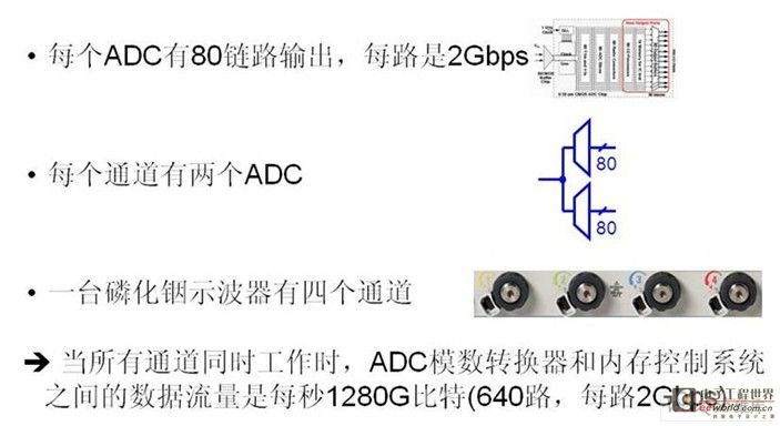 亿,远比一般示波器使用的通用CPU快,该专用芯片也用在安捷伦最快的逻辑分析仪上,同时,该技术稍加改动后也被用到低阶的产品中。 图7 当磷化铟示波器4个通道一起工作时,你每次按下“运行”按钮,每秒1280G比特的数据流就会被处理 我们来看一下示波器内部模数转换器和内存控制专用芯片的串行数据流量,如图7所示,每个模数转换器有80路串行链路输出,每路的速率是2 Gb/s,示波器每个通道后面有2个模数转换器,示波器共4个通道。这意味着当你每次按下示波器上的“Run”按钮时,每秒中的数据流量是1280Gbit(80 x 2 Gb/s x 2 x 4),该图也显示出在芯片中采用串行信号接口的威力,在测量仪器中,大量采样串行链路设计意味着仪器设计者非常熟悉串行设计可能面临的各种设计难题和挑战。 至此,我们通过6篇技术揭秘文章讲解了磷化铟示波器中采用的创新技术,大家可以猜想下一步, 根据安捷伦示波器部门总经理,Jay Alexander的说法,他只是根据已经制定好的策略执行而已,高端技术创新会往更高的实时带宽走,带宽超过32GHz后,模数转换技术会跟着有进一步的改进,同一时间,高端技术会逐步被用到低中端产品中。我们可以耐心等待下一个技术或产品的发布。