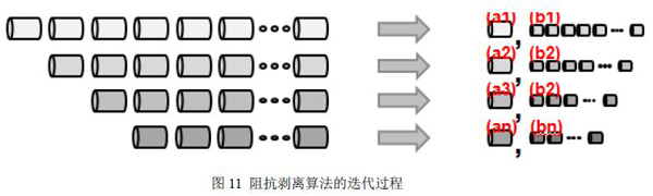 时域Gating 方法是通过将整个测量系统(包括夹具和被测件DUT)的S 参数先通过算法转换为阻抗(Z),然后通过夹具的延时和损耗两个参数将整个系统的阻抗曲线中的夹具部分的阻抗曲线剥离掉,然后将剥离掉的夹具的阻抗曲线后的部分重新转换为S 参数,从而实现夹具的去嵌。如下图8 所示,蓝色虚线部分为夹具的阻抗曲线: