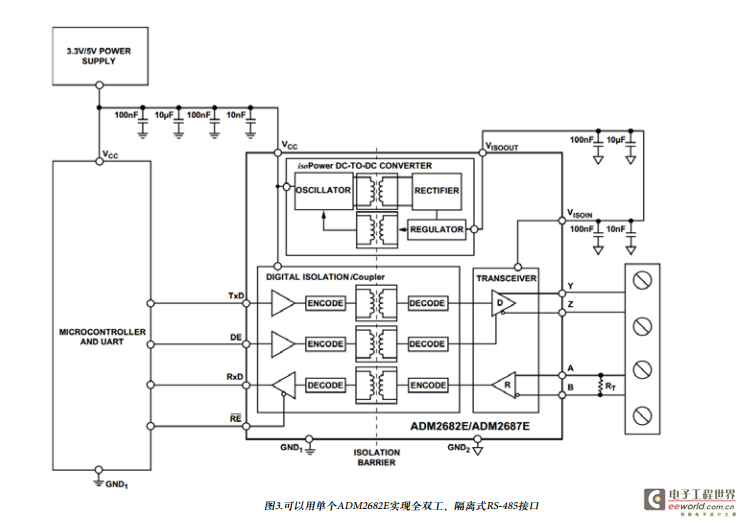 许多仪器内置隔离式RS-485端口,用于远程监控或控制。几年前,实现这样的隔离端口不但需要为数据线路配置隔离器,而且需要兼容RS-485差分信号和电源的收发器。图3显示了像ADM2682E这样的单个IC如何将所有功能集成到单个封装之中。