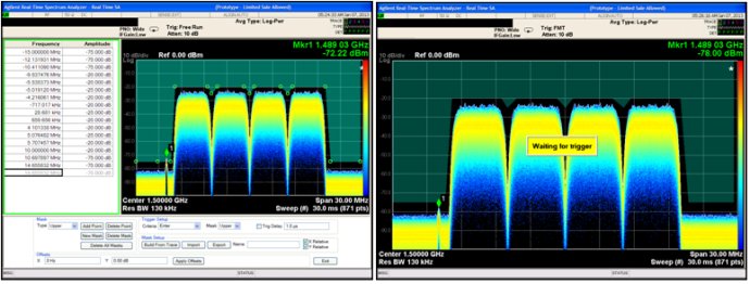 频率模板触发是把频谱形状与用户定义的模板进行对比以产生触发条件捕获感兴趣的信号。即使在存在电平高得多的其他信号时,频率模板触发仍可以可靠的检测弱信号。这种存在强信号时触发弱信号的能力,对检测间歇性信号、是否存在互调产物、瞬时频谱包容违规等至关重要。