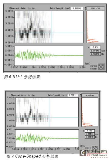 学地震试验台模拟地震信号,得到了地震动频率-时间关系,图6 至图7 是用STFT 和ConeShaped 两种算法得到的分析结果,从图中可以看到,约在0-20 秒时间范围内,地震动中心频率大约为1.5HZ,约在8 秒时,地震动频率约为3.0Hz.