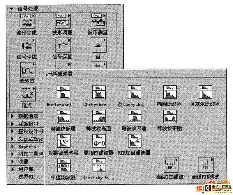 LabVIEW中提供了多种滤波器和用来设计滤波器的函数节点和Ⅵ。滤波器节点位于函数选板的“信号处理-滤波器”,如图所不。