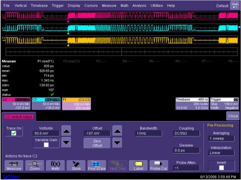 我们知道,带宽的限制对信号的捕获会带来下面的影响:1,使被测信号的上升沿变缓。2,使信号的频率分量减少。3,使信号的相位失真。 那么,“对于5MHz的时钟信号,需要用多少带宽的示波器来测量?” 这是我在培训时常问的一个问题。我很少能得到令我满意的答案,很少有工程师反问我:“这5MHz的时钟信号是方波还是正弦波,如果是方波,其上升时间是多少?” 我常得到的回答是,“100MHz带宽就足够了,示波器带宽通常是被测信号频率的3-5倍,100MHz余量很大了。” 图13显示了5MHz的方波信号在不同带宽时测试出的波形。其中,M1和M2是分别在6GHz和1GHz时波形,C3是带宽限制到200MHz的测试结果。 图14显示在带宽限制到200MHz时测量出的5MHz的上升时间均值为本1.70357ns,而图15显示的是在6GHz带宽时的上升时间为873.87ps。这表明,对于5MHz的时钟,因为其上升时间比较快,最好用1GHz以上带宽的示波器来测量其上升时间,200MHz时其上升沿变缓; 1GHz带宽和6GHz带宽对于测试800ps的上升时间结果几乎一样。 对于USB2.0信号的测试,需要多少带宽?对于PCI-E G2信号的测试需要多少带宽?对于电源测试,需要多少带宽? 对于1000Base-T信号的测试,需要多少带宽?对于10Gbps的背板测试,需要多少带宽? …… 我们常要回答这些问题。 下面的三条规则就是我们的回答。