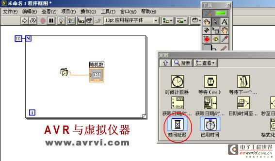 5.运行程序,便可在前面板上看到结果。 6.因为程序的运行的速度非常快,我们无法一个一个地看清所产生的10个随机数,我们可以在程序框图中添加时间延迟控件。它位于函数→编程 →定时→时间延迟,如图: