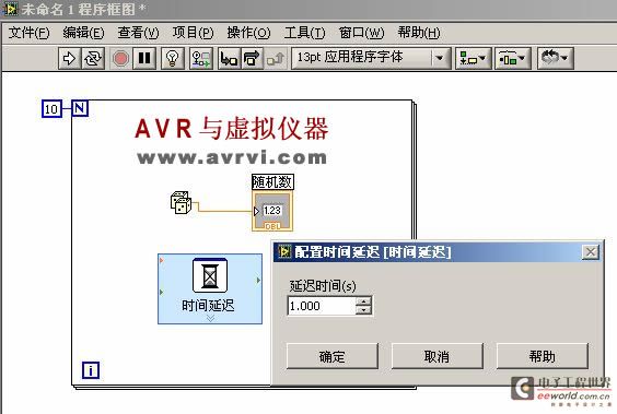 7. 放置它到程序框图上,选择延迟的时间,即两次循环之间的时间间隔。如图: