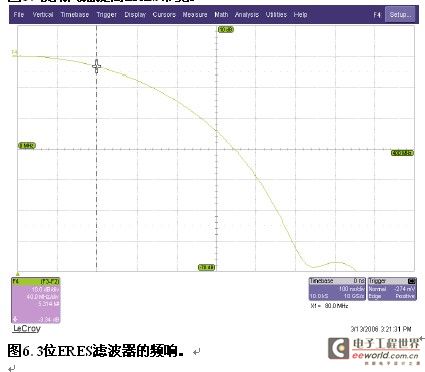 函数使有效采样率提高了10:1。选配的内插数学函数可以把有效采样率提高达 50:1。在图5中,上面的一对曲线显示了以20 GS/s采样的波形。2位的增强分辨率把带宽降低到580 MHz。通过应用(sinx)/x内插,有效采样率提高到200 GS/s,2位增强的增强分辨率带宽现在是5800 MHz。 注意事项 增强分辨率函数只会改善曲线的分辨率,不会改善8位ADC原始量化的精度或线性度。高分辨率滤波器具有良好临时响应的限制,不能使用最大平坦滤波 器。因此,传输频带会导致截止频率附近的信号发生小的衰减。所以,在使用这些滤波器时,一定要注意通过的最高频率可能会略微衰减。图6是典型高分辨率滤波 器的频响(3位增强滤波器),其中标出了80 MHz的-3 dB截止频率或1.6%的Nyquist频率。 必须在有限记录长度上执行滤波。记录末端有不连续点,因为没有定义这些点上的滤波输出。数字示波器没有显示这些数据点,因此在滤波后曲线变得略短。 丢失的样点与使用的滤波器的脉冲响应长度完全相同,因此在2 – 106个样点之间变化(参见表1)。由于这里介绍的示波器有非常长的波形存储器,因此通常注意不到这种丢失(在最坏情况下,其只占50,000点曲线的 0.2%)。但是,用户可能会要求滤波很短、没有数据输出的记录。在这种情况下,DSO将不允许使用滤波。 VI. 总结 第III部分和第IV部分的实例分别说明了增强分辨率函数的功能:一个降低噪声和低通滤波,另一个是改善垂直分辨率。但在许多情况下,这两种功能是 共存的,其会以与平均函数非常类似的方式对得到的增强分辨率曲线产生综合影响。因此,在单次应用中,增强分辨率为替代平均函数提供了理想的方案。