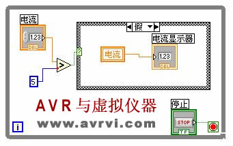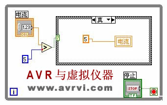 程序的目的是检验电流量,如果电流大于5A时,则限定电流量为上限5A,这时电流局部变量时写入状态,可以向它写入数据5A,尽管电流控件是控制器;如果电流小于5A时,则将电流通过一个“电流显示器”来显示,这时就需要将电流局部变量改变为读取状态,方法是在快捷菜单上执行“转化为读取”命令。