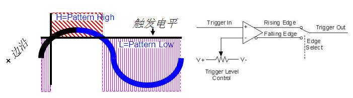 e、码型长度在预设时间范围内触发(预设码型最短时间长度或最长时间长度,示波器触发在此范围内的码型)