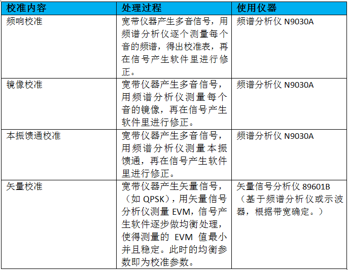 宽带信号产生的另一个关键点是:校准或数字预失真。不论是使用宽带仪器,宽带器件,或自己设计的宽带系统,校准或数字预失真都是一个必须的过程,因为宽带仪器或器件及系统,只靠硬件性能是无法产生比较完美的宽带信号。校准的参数和处理过程如表6所示。