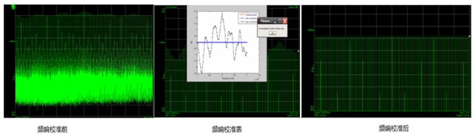 图2是频响校准的实例,由宽带仪器产生100个音的多音信号,用频谱分析仪自动测量每个音的功率,形成校准表,通过软件修正后,输出的频响是非常平坦的,可满足各种测量的要求。