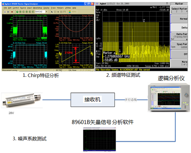 图4 宽带信号测量和分析实例(1.雷达信号Chirp特征分析;2.频谱特征测试;3.接收机噪声系数测试)