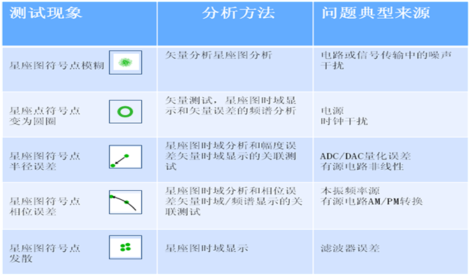 使用宽带仪器进行宽带系统的信号分析,除了测量确定系统和信号的指标外,也用信号分析的手段帮助定位问题的可能根源。因为分析软件能独立地分析信号的幅度误差,频率误差和相位误差,这样可以判断误差的基本来源,分析过程中,可以利用时域和频域的关联分析来得到误差的特性是随机误差还是周期误差,这样问题信号的来源就很快得到定位。表8是典型电子系统误差来源分析的案例。