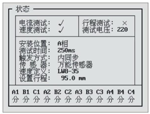 在这个界面下可以检测仪器的断口通道是不是完好,断口输入如果是悬空,应该显示“分”,如果对地短路,则应该显示“合”。所以分别把各个断口对地短接一下,观察状态显示的变化,来确定仪器断口时间通道是否正常。