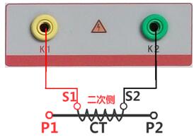 接线图见(图5),测试仪的K1、K2为电压输出端,试验时将K1、K2分别接互感器的S1、S2(互感器的所有端子的连线都应断开)。检查接线无误后,合上功率开关,选择“开始”选项,即开始测试。