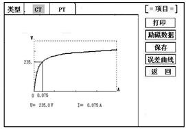 励磁电流:设置范围(0—20A)为仪器输出的最高设置电流,如果实验中电流达到设定值,将会自动停止升流,以免损坏设备。通常电流设置值大于等于1A,就可以测试到拐点值。励磁电压:设置范围(0—2500V)为互感器测试仪输出的最高设置电压,通常电压设置值稍大于拐点电压,这样可以使曲线显示的比例更加协调,电压设置过高,曲线贴近Y轴,电压设置过低,曲线贴近X轴。如果实验中电压达到设定值,将会自动停止升压,以免损坏设备。