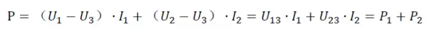 R相电流I1和R-S电压U12接到一个功率测量单元,计算的功率记为P1=I1•U12P1=I1•U12;S相电流I2和S-T电压U23接到一个功率测量单元,功率记为P2=I2•U23;T相电流I3和T-R电压U31接到一个功率测量单元,计算的功率记为P3=I3•U31。那么,三相功率是以上测量3个功率之和P=P1+P2+P3吗?这显然是错误的,线电流与线电压相乘并非相功率,角形接法亦然,正确应是: