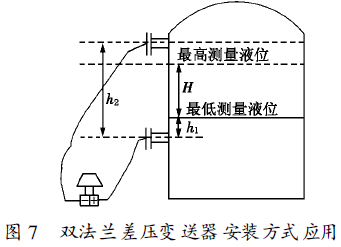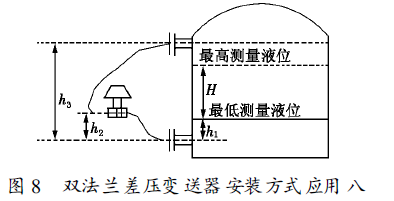 3) 双法兰差压变送器高低压室法兰与容器高低端法兰相连接, 并且变送器安装在密闭容器高低端法兰水平线之间, 如图8所示。