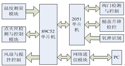 为实现上面所述的各项功能,自动热量系统采用PC、主单片机89052和从CPU 8902051协同工作的方式,各项功能划分如图2所示。温度测量、点火丝检测与控制、风扇搅拌以及网络接口由89052实现,阀门、内筒控制和氧弹识别等由8902051完成,PC机则完成样重采样和各89052数据收集、数据处理、数据运算、存储、报表生成和硬拷贝输出。PC和两单片机之间通过CAN网络依据命令交互协调工作进程。