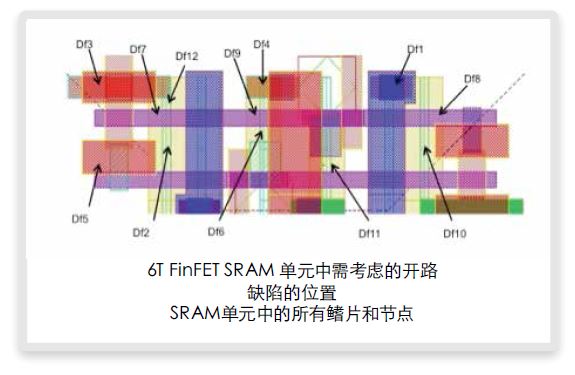 图7:FinFET存储器单元版图中注入的开路缺陷实例 缺陷注入展示了每种缺陷的行为方式。接下来的任务就是通过测试序列识别(TSI)找到检测缺陷的测试序列。对于每种潜在的缺陷,一个或多个测试序列得以识别,同样其检测的条件及对应的故障模型也被确定。通常需要使用大量的测试序列、应力角和模拟设置,直至找出一个能明显区别于零缺陷单元的序列。