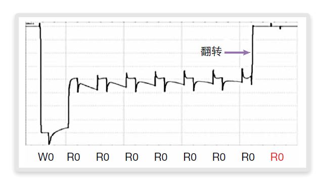 有些情况下,这些缺陷会是以前在平面工艺中见过的故障模型,但FinFET存储器有几种额外的失效模式。比如,图8给出了一种微妙的失效模式。下拉晶体管中的电阻性鳍片开路导致动态伪读破坏故障(dDRDF)。在此,一个写操作,接着7个读操作,导致存储器单元的位值翻转。然后可以更加详细地分析此故障,因为它原来与频率有关。在1.2MHz频率上,产生这个故障仅用了4次读操作,而在4MHz上,则用了18次读操作。温度和电压也会影响这些值。