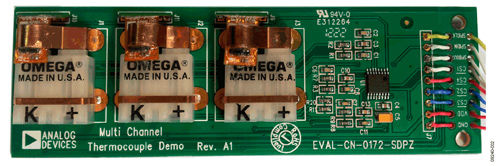 图2显示带有3个K型热电偶连接器的EVAL-CN0172-SDPZ电路评估板,AD7793 ADC, 和ADT7320温度传感器安装在独立柔性印刷电路板(PCB)的两块铜触点之间,用于基准温度测量。
