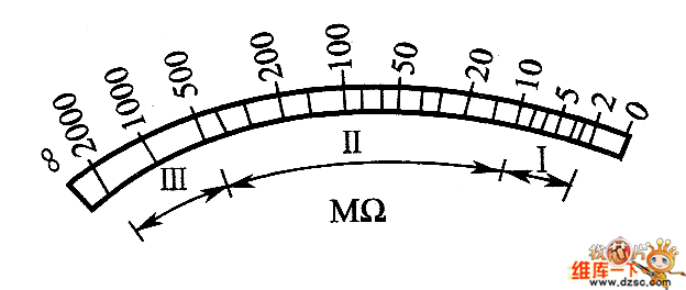(1)测量范围(MΩ) 通常仪表的测量范围是指表盘的指示范围(如有其他量程挡,应乘以量程倍率系数)。按国家检定规程规定,表盘的指示值分为Ⅰ、Ⅱ、Ⅲ三个区段,如图所示。Ⅰ区段为起始刻度点到Ⅱ区段起始点;Ⅱ区段最长,一般不得小于标度尺全长的50%;Ⅲ区段为Ⅱ区段终点到标度尺终点。通常,Ⅰ、Ⅲ区段为低准确度区,Ⅱ区段具有最高测量准确度。绝缘电阻表的测量范围是指标度尺Ⅱ区段示值范围。图示出的绝缘电阻表测量范围是10~500MΩ。