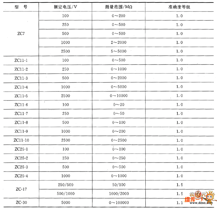 (2)绝缘电阻表的选择 由于被测电气设备工作电压、工作环境湿度不同,因此对绝缘程度的要求亦不同,所以应按电压等级和测量范围来选择合适的绝缘电阻表。几种常见型号绝缘电阻表的技术参数见表1。