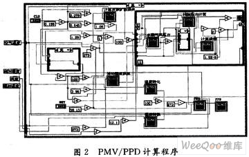 针对以上五个公式,运用LabVIEW编写PMV,PPD计算程序。由式(2)可知,tcl的计算是一个迭代过程,它通过LabVIEW中While循环结构实现;hc,fcl通过条件结构进行判断,最后将式(2)~式(4)代入式(1)求出PMV。具体程序如图2所示。