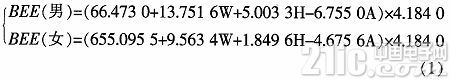 式中:BEE——基础能量消耗,J;W——体重,kg;H——身高,cm;A——年龄,岁;