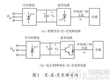 在交-直-交变频器中,通常要求直流电路采用可控硅整流电路,如图1(a)所示。逆变输出的电压Uo 的大小可以通过改变Ud 的大小来控制。通过对逆变器触发电路频率的控制,可以改变输出电压Uo 的频率。但是,这种变频电路存在有缺陷:如果输出的交流电压为含有较多谐波的矩形波,这无论是对负载或是交流电网都是不利的;如果输出功率用相控方式来调节,就会使输入功率因数降低,同时由于有滤波大电容存在于中间直流环中,使得调节输入功率时惯性较大,系统响应缓慢。
