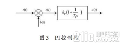 PI控制器是具有比例-积分控制规律的控制器,其框图如图3 所示,其控制规律是指控制器的输出信号u(t)既反映输入信号 e(t),又反映 e(t)对t的积分,即: